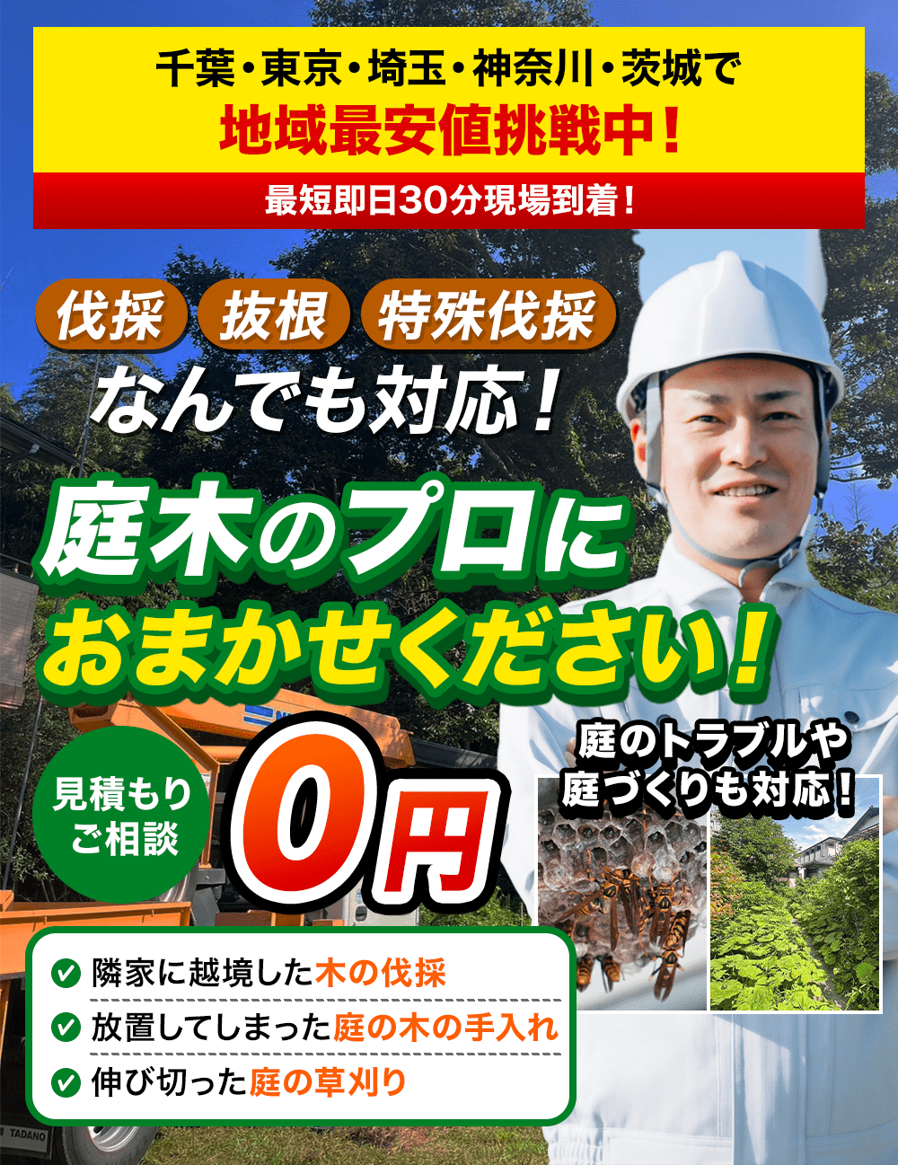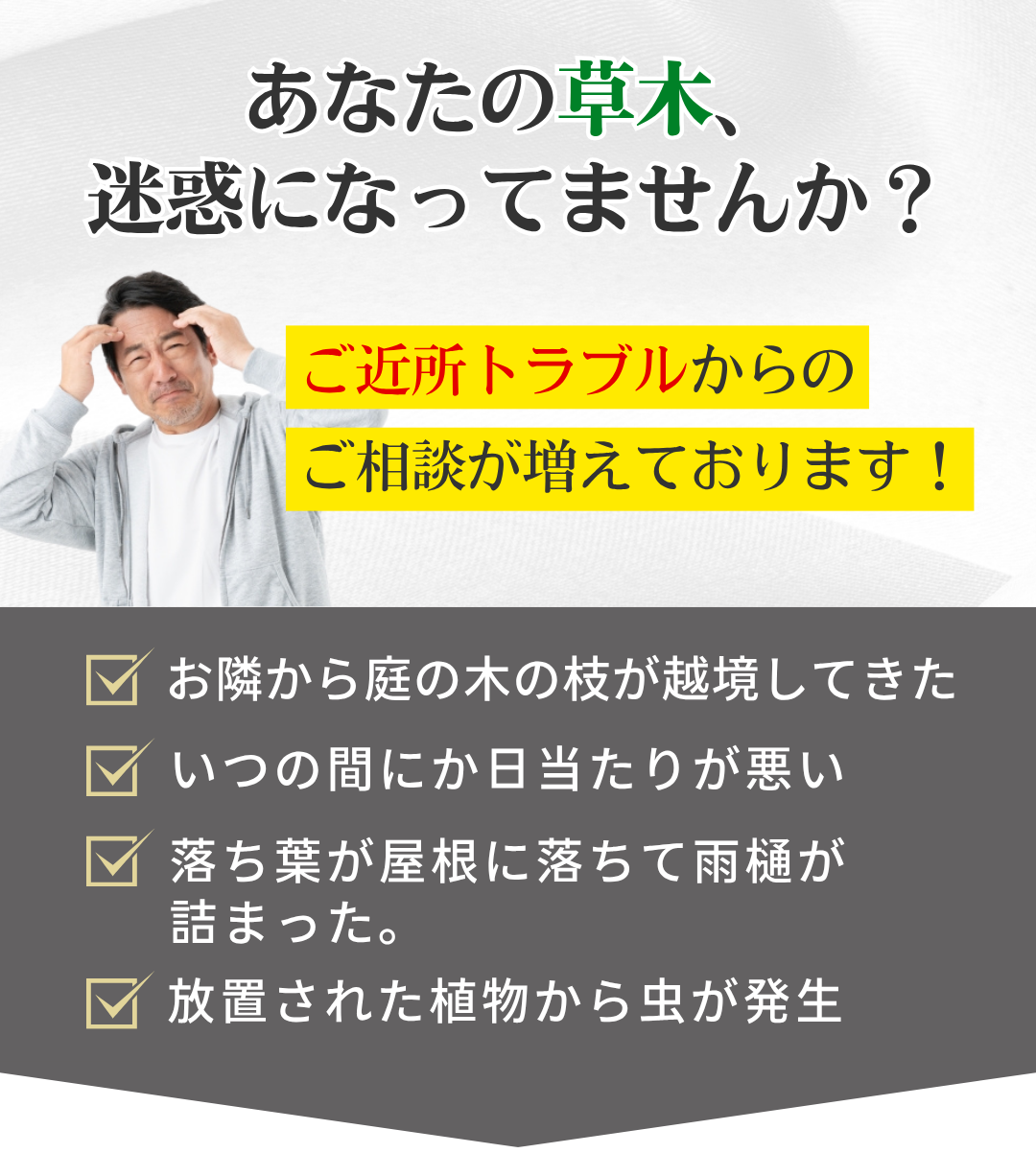 木1本からお伺いいたします!少しだけ枝を切って欲しいだけだから。と、なかなかご連絡に踏み出せない方が多いですが、ご安心ください!どんなご相談でも大歓迎です! -